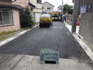 施行中 やはりフィニッシャー入れて、ローラーで転圧すると